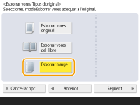 ![]() | Si copieu originals més petits que la mida del paper imprès, poden aparèixer línies a la imatge copiada. En copiar les pàgines d'un llibre gruixut, poden aparèixer vores fosques. <Esborrar vores> us permet esborrar aquestes línies i vores fosques. També podeu configurar l'equip perquè no copiï les perforacions dels originals. |