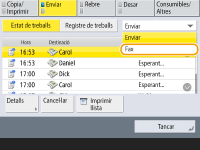 Cancel·lació immediata d'un treball que s'està enviantSi premeu al tauler de control per cancel·lar un treball de fax mentre s'envia, es mostrarà el missatge <Voleu cancel·lar els següents treballs d'enviament?>. Premeu <Sí> per cancel·lar l'enviament del fax.Podeu seleccionar <Últim treball rebut> o <Treball en procés d'enviament> per triar el treball que voleu cancel·lar. <Treball que es cancel·larà en prémer Aturar> Premeu si hi ha diversos treballs d'enviament per visualitzar la pantalla que permet seleccionar el treball que voleu cancel·lar. Si el treball d'enviament que voleu cancel·lar no hi apareix, premeu <Compr. altres treballs> per visualitzar <Enviar treballs>. Seleccioneu el treball que voleu cancel·lar i premeu <Cancel·lar>. |