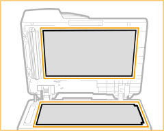 Netegeu la part posterior del alimentador/tapa de còpia i el vidre de còpia.