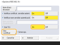 L'equip i el servidor d'autenticació s'autentiquen entre ells enviant-se certificats mútuament. Cal desar un certificat de CA a l'equip per verificar el certificat (certificat de servidor) enviat des del servidor d'autenticació. A més, en aquesta opció cal especificar una clau i un certificat en format PKCS#12 (certificat de client), de manera que el servidor d'autenticació pugui autenticar l'equip. Deseu aquests elements abans de configurar les opcions (