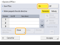 Independentment de les opcions de <Mètode xifratge formats per a FIPS 140-2> per a la comunicació IPSec, s'utilitzarà un mòdul de xifratge que ja disposi del certificat FIPS140-2. Per tal que la comunicació IPSec compleixi amb FIPS 140-2, heu d'establir la longitud de clau de DH i RSA per a la comunicació IPSec en 2048 bits o més en l'entorn de xarxa al qual pertanyi l'equip. Des de l'equip només es pot especificar la longitud de clau de DH. Tingueu-ho en compte quan configureu l'entorn, perquè a l'equip no hi ha opcions per a RSA. Podeu desar fins a 10 polítiques de seguretat. |