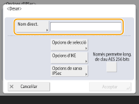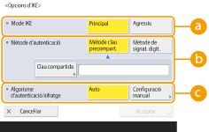 2 | Configureu les opcions necessàries. ![]() <Mode IKE>Seleccioneu el mode d'operació per al protocol d'intercanvi de claus. La seguretat augmenta si seleccioneu <Principal> perquè la sessió IKE està xifrada, però la velocitat de la sessió és més lenta que amb <Agressiu>, que no xifra la sessió sencera. <Mètode d'autenticació>Seleccioneu un dels mètodes d'autenticació descrits a continuació.