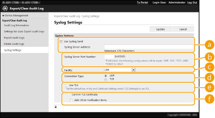 Després que l'exportació automàtica dels registres d'auditoria s'hagi dut a terme correctament, els registres d'auditoria recollits s'eliminaran automàticament. Els registres d'auditoria no es poden eliminar manualment. Després que l'acció d'eliminar i exportar automàticament els registres d'auditoria hagi sigut satisfactòria, es genera cada registre. Si no es produeixen altres recopilacions de registres la propera vegada que es faci una exportació automàtica, el registre d'auditoria no s'exportarà automàticament. També podeu exportar manualment registres d'auditoria des de Remote UI (IU remot). Exportació d'un registre com a fitxer Si es produeix un error en l'exportació automàtica, l'equip ho tornarà a provar diverses vegades. Si es produeix un error en l'exportació automàtica encara que sigui una sola vegada, apareixerà un missatge d'error al tauler de control de l'equip. Especifiqueu un servidor SMB per a Server 2012 o posterior, o Windows 8 o posterior. Si l'equip s'apaga, l'exportació no es durà a terme, ni tan sols a l'hora especificada. Tampoc no es durà a terme quan l'equip es recuperi. Si l'equip està en el mode repòs, es recuperarà automàticament i durà a terme l'exportació a l'hora especificada. Tingueu en compte que si utilitzeu un servidor que no admet comunicació xifrada SMB v3.0, les dades dels registres d'auditoria es transmeten sense xifrar a través de les vies de comunicació mentre s'exporten automàticament. Segons el vostre entorn, l'exportació automàtica dels registres es pot dur a terme més tard de l'hora especificada. |