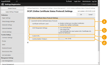 Hi ha dos mètodes per comprovar si els certificats rebuts de l’altra part en comunicació són vàlids: comparar amb la llista de revocació de certificats (CRL) registrada a l’equip o consultar un OCSP Responder (protocol d’estat de certificat en línia), un servidor que suporta OCSP. Establiu el mètode per comprovar la caducitat dels certificats segons el vostre entorn. Aquest registre només el pot dur a terme l’administrador.