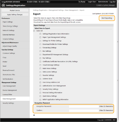 Quan importeu les dades d'opcions exportades, caldrà la contrasenya de [Encryption Password]. Utilitzeu caràcters alfanumèrics.