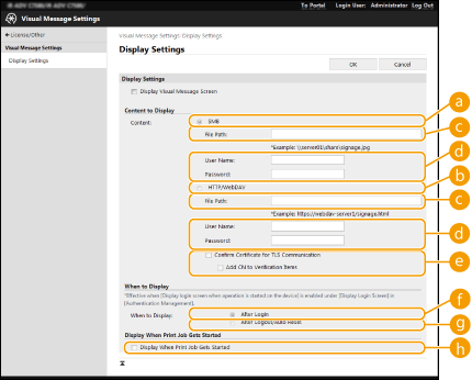 El contingut es mostra en els moments que s'indiquen a continuació: Quan l'opció <Opcions de pantalla d'inici de sessió> està establerta en <Mostrar en inic. operació disp.>: Seleccioneu [After Login] o [After Logout/Auto Reset] Quan l'opció <Opcions de pantalla d'inici de sessió> està establerta en <Mostrar en selecc. funció>: després que s'iniciï el mode de reinici automàtic Quan l'opció <Usar autenticació d'usuari> està establerta en <Off>: després que s'iniciï el mode de reinici automàtic Si heu establert la funció de Missatge visual, podreu comprovar el contingut del <Missatge visual> al Inici, independentment del temps esmentat. Establiu un fitxer desat al servidor de fitxers o bé a la bústia avançada d’una altra impressora Canon multifuncional de la mateixa xarxa com a contingut per mostrar. Treball amb altres dispositius També podeu establir com a contingut un lloc web d'Internet mitjançant el servidor proxy. Les opcions de proxy d'aquesta funció són les mateixes que a <Opcions de proxy>. Si la impressió amb retenció obligatòria està activada i la casella [Display When Print Job Starts] marcada, es mostrarà el contingut en començar la impressió. |