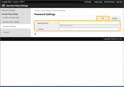 Introduïu la contrasenya actual a [Current Password:] i feu clic a [OK] sense introduir cap valor per a [New Password:] o [Confirm:] (deixeu els camps en blanc). Si s'ha configurat un límit de caràcters d'entrada a [Password Settings Policy], cal introduir un valor per a aquesta opció. Cancel·leu el límit abans d'eliminar la contrasenya.