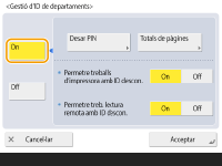 Assegureu-vos que s'hagin definit ID de departament per als usuaris desats a l'equip. Desament d'informació d'usuaris al dispositiu local La gestió de l'ID de departaments només és vàlida per als usuaris que estan desats al dispositiu local. Si inicieu la sessió com a usuari amb privilegis d'administrador, se us assignarà automàticament un ID i un PIN d'administrador del sistema, que es gestionaran com a ID de departament. |