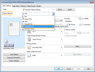 Els treballs d'impressió programats s'executen d'acord amb l'hora establerta a l'equip. Confirmeu prèviament que l'hora establerta a l'equip coincideix amb la del vostre ordinador. Si un treball d'impressió es programa per a una hora amb 24 hores d'antelació, el treball es cancel·la. L'hora d'inici d'una impressió, entre les 0:00 i les 23:59, s'especifica a la pantalla de controlador d'impressora, però l'hora es processa en el format d'any, mes, dia, hora, minut i segon (amb el segon fixat a 0). |
