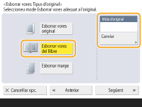 <Esborrar vores>.1 | Premeu <Esborrar vores original> i marqueu <Mida d'original>. ![]() Si la mida que apareix a <Mida d'original> és diferent de la mida de l'original, premeu <Canviar> per seleccionar la mida. Només es poden llegir les mides originals que es mostren a la pantalla tàctil. |