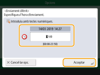 Podeu comprovar a la pantalla <Monitor estat> si l'enviament/desament ha finalitzat o no. Comprovació de l'estat i el registre de documents llegits Podeu reservar fins a 64 treballs per a l'enviament diferit. Tanmateix, pot ser que el nombre real de treballs d'enviament que pot gestionar l'equip sigui inferior a 64 en funció de les condicions següents: Si esteu enviant diversos documents al mateix temps Si s'envien documents grans Si la bústia de fax/I-fax utilitza una gran quantitat de memòria |
