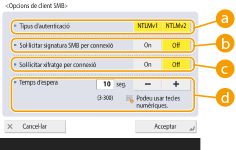 En funció de les opcions de xarxa, pot ser que es mostri un error en fer enviaments al servidor SMB. En aquest cas, ajusteu el temps a <Temps d'espera>. |