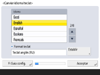 Seleccioneu l'idioma que s'ha de mostrar a les pantalles. En funció de l'idioma, podeu canviar la disposició del teclat que es mostra per introduir caràcters. ![]() ![]() Seleccioneu l'idioma i premeu <Bé>. Per canviar la disposició del teclat, premeu <Establir>, seleccioneu la disposició del teclat i premeu <Bé>. Visualitzar el botó per canviar els idiomes pot resultar molt útil per canviar l'idioma freqüentment. Canvi de l'idioma de visualització | |