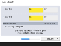 Especifiqueu les opcions per a la connexió de xarxa. ![]() ![]() Premeu <On> per a <Usar IPv4> o <Usar IPv6> i premeu <Següent>. També podeu usar IPv4 i IPv6. Si premeu <Off> per a <Usar IPv4> i <Usar IPv6> i premeu <Bé>, ometeu les opcions de xarxa i aneu al pas 9. ![]() Si premeu <On> per a <Usar IPv4>, especifiqueu les opcions següents. ![]() Per obtenir l'adreça IP automàticament, premeu <DHCP> o <IP auto> i premeu <Següent> o <Acceptar>. Per establir l'adreça IP manualment, esborreu la selecció de <DHCP> o <IP auto>, premeu <Adreça IP>, <Màscara de subxarxa> i <Adreça porta enllaç> per introduir cada valor i premeu <Següent> o <Acceptar>. Per obtenir informació sobre les opcions de l'adreça IPv4, vegeu Configuració d'una adreça IPv4. ![]() Si premeu <On> per a <Usar IPv6>, especifiqueu les opcions següents. ![]() Premeu <On> per utilitzar l'adreça sense estat o <Off> per no utilitzar l'adreça sense estat i premeu <Següent>. Per obtenir informació sobre les opcions de l'adreça IPv6, vegeu Configuració d'una adreça IPv6. ![]() Després d'especificar l'adreça sense estat, especifiqueu les opcions següents. ![]() Premeu <On> per utilitzar l'adreça manual o <Off> per no utilitzar l'adreça manual i premeu <Següent>. Per utilitzar l'adreça manual, premeu <Adreça manual>, <Longitud de prefix> i <Adr. encamin. predetermin.> per introduir cada valor. ![]() Després d'especificar l'adreça manual, especifiqueu les opcions següents. ![]() Premeu <On> per usar DHCPv6 o <Off> per no usar DHCPv6 i premeu <Bé>. | |