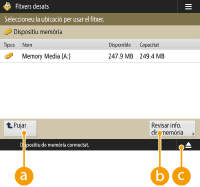 <Revisar info. dis. memòria>Permet comprovar el número de sèrie i l'espai lliure del dispositiu de memòria.