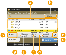 Fitxers i carpetes desatsMostra si els fitxers i les carpetes seleccionats, les icones que indiquen el tipus de fitxer o la carpeta, els noms, les mides dels fitxers i les dates i hores en què es van desar.