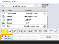 ![]() | Faxové číslo nebo e-mailovou adresu příjemce, které lze použít při odesílání naskenovaných dokumentů můžete uložit do adresáře. Do adresáře můžete také uložit I-faxové místo určení a umístění složky na souborovém serveru (IP adresu a cestu) a úložiště (Rozšířená schránka) multifunkční tiskárny Canon jako místo určení v adresáři. |