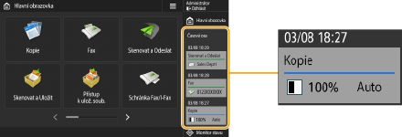 Tato tlačítka umožňují otevřít obrazovky základních funkcí, jako „Kopie“ a „Skenovat a Odeslat“.