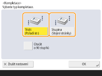 V případě některých typů papíru nelze kompletační funkce používat. Specifikace hardwaru Při ukládání originálu na kopírovací deskuPo stisknutí <Volby> <Tvorba úlohy> na obrazovce základních kopírovacích funkcí můžete používat funkci Třídit/Skupina, i když originál uložíte na kopírovací desku.Při tisku s pomocí funkce třídění do skupin vložte mezi jednotlivé skupiny stránek oddělovač úlohVyberete-li <Skupina (Stejné stránky)>, můžete mezi jednotlivé skupiny vložit oddělovač úloh. Další informace viz v <Oddělovač úloh mezi skupinami>. <Kopie> <Oddělovač úloh mezi skupinami>Při konfiguraci nastavení v <Přístup k ulož. soub.>Funkce kompletace lze použít pouze při tisku souborů PDF nebo XPS. |