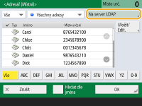 <Uložit nové místo určení>, <Detaily/Editovat> a <Smazat> v části <Uložit/Editovat> na obrazovce <Adresář (Místní)> lze použít k registraci nových míst určení, kontrole podrobností a úpravě/odstranění míst určení. Aby bylo možné vzdálený adresář používat, je nezbytné provést nastavení serverového stroje. Proveďte nastavení pro otevření vzdáleného adresáře na serverovém stroji. |