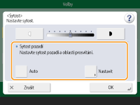 ![]() | Můžete rovněž nastavit sytost pozadí. Můžete tak odesílat kvalitní faxy originálů s barevným pozadím nebo tenkých originálů, například novin, u nichž prosvítají znaky a obrazy ze zadních stran. Nastavení sytosti pozadí |