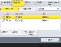 Stisknutím <Detaily> <Odeslat znovu> můžete opětovně odeslat dokumenty, jejichž odeslání se nezdařilo. Pro zadání dalšího místa určení stiskněte <Změnit místo určení>. Pro dokumenty, pro něž bylo zadáno více míst určení s použitím stejné metody odesílání, stiskněte <Seznam vysílání>, vyberte místo určení a poté stiskněte <Odeslat znovu> nebo <Změnit místo určení>.Dokumenty můžete opětovně odesílat, když je <Smazat chybné úlohy VYS.> nastaveno na <Vyp> (<Smazat chybné úlohy VYS.>). Upozornění. Opětovně nelze odesílat dokumenty odeslané s pomocí metod Přímé odesílání/Ruční odesílání/Faxování z počítače. Místa určení dokumentů, pro něž je nastaveno odesílání v zadaný čas, a také dokumentů, jejichž odeslání se nezdařilo, můžete změnit. Upozornění. Změnit nemůžete místa určení právě odesílaných dokumentů, pro něž bylo zadáno více míst určení, nebo když je zakázáno zadání nového místa určení (Omezení dostupných míst určení). Místo určení lze změnit pro úlohu, která byla zrušena z důvodu chyb při vysílání, nebo úlohu, která na odeslání čeká v režimu Odložené odesílání. Nelze měnit najednou více míst určení. Nelze také najednou měnit místa určení ve skupině. |
