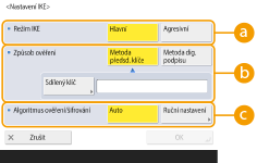 <Algoritmus ověření/šifrování>Zde výběrem <Auto> nebo <Ruční nastavení> nastavte způsob zadávání algoritmu ověřování a šifrování pro IKE fáze 1. Jestliže vyberete <Auto>, algoritmus, který může používat jak stroj, tak komunikační partner, se nastaví automaticky. Chcete-li zadat konkrétní algoritmus, vyberte <Ruční nastavení> a proveďte níže uvedená nastavení.