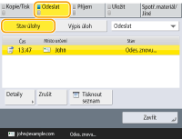 Stisknutím <Detaily> <Odeslat znovu> můžete opětovně odeslat/uložit dokumenty, jejichž odeslání/uložení se nezdařilo. Pro zadání dalšího místa určení stiskněte <Změnit místo určení>. Pro dokumenty, pro něž bylo zadáno více míst určení s použitím stejné metody odesílání/ukládání, stiskněte <Seznam vysílání>, vyberte místo určení a poté stiskněte <Odeslat znovu> nebo <Změnit místo určení>.Dokumenty můžete opětovně odesílat/ukládat, když je <Smazat chybné úlohy VYS.> nastaveno na <Vyp>. <Smazat chybné úlohy VYS.> Místa určení dokumentů, pro něž je nastaveno odesílání/ukládání v zadaný čas, a také dokumentů, jejichž odeslání/uložení se nezdařilo, můžete změnit. Upozornění. Změnit nemůžete místa určení právě odesílaných/ukládaných dokumentů, pro něž bylo zadáno více míst určení, nebo když je zakázáno zadání nového místa určení (Omezení nových míst určení). |