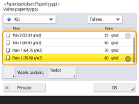 Jos lisätty paperityyppi ei ole näkyvissä, valitse se luettelosta valitsemalla <Asetukset>.