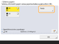 Jos näytössä näkyvä paperikoko/tyyppi eroaa lisätyn paperin koosta/tyypistä, <Aseta>.