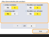 <Unitilan merkkiääni> | Äänimerkki kuuluu, kun laitteeseen kytketään virta tai siitä katkaistaan virta, kun asetat <Pikakäynnistyksen asetukset päävirralle> -asetukseksi <Kyllä>. (Tilanteesta riippuen laite ei ehkä pikakäynnisty, jolloin merkkiääntä ei kuulu.) |