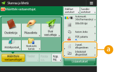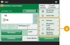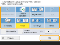 Perustoimintojen näyttöön sijoitetut asetusnimikkeet ja näytettävä sijainti vaihtelevat eri toiminnoissa. Pikapainiketta ei näytetä, jos pikapainikkeeksi on asetettu <Nimeämätön>. Tallennettavien <Lisäasetukset>-pikapainikkeiden enimmäismäärät ovat seuraavat. Kopio: 5 Faksi: 4 Skannaa ja lähetä: 2 |