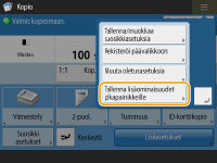 Tallentaminen <Suosikkiasetukset>-kohtaan<Suosikkiasetukset>-kohdassa voit tallentaa usein käytettyjä kopiointitoimintoja sekä skannaukselle usein määritettyjä vastaanottajia ja asetuksia. Lisätietoja on kohdassa Usein käytettyjen toimintojen yhdistelmän tallentaminen. Oletusasetuksen vaihtaminen perustoimintonäytössäKun olet vaihtanut kunkin toiminnon asetukset, voit tallentaa nykyiset asetukset oletusasetuksiksi perustoimintojen näytössä valitsemalla ja sitten <Muuta oletusasetuksia>. Jos kirjaudut laitteeseen ennen tämän asetuksen määrittämistä henkilökohtaisen todentamisen hallinnalla (Laitteeseen kirjautuminen), se tallennetaan henkilökohtaiseksi oletusasetukseksesi (Mukautettavien kohtien luettelo). |