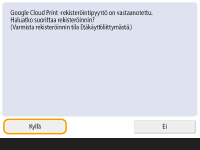 Rekisteröiminen mobiililaitteesta tai Google ChromestaVoit rekisteröidä laitteen mobiililaitteesta tai Google Chromesta. Seuraava vahvistusnäyttö näkyy laitteen näytössä ennen kuin rekisteröinti on valmis. Saata rekisteröinti päätökseen painamalla <Kyllä>. Lisätietoja rekisteröintitavoista on laitteen oppaassa ja Google Cloud Print -kotisivulla. |