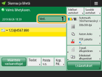 Määritettyjen vastaanottajien määrän tarkistaminenMääritettyjen vastaanottajien määrä näkyy näytön oikeassa yläkulmassa. Näin voit varmistaa ennen lähettämistä, että vastaanottajien määrä on oikea. ![]() Jos haluat peruuttaa lähetettävän työn hetiJos painat käyttöpaneelissa , kun työtä lähetetään, esiin tulee ilmoitus <Peruutetaanko seuraava lähetystyö?>. Peruuta lähetys valitsemalla <Kyllä>.Voit valita peruutettavaksi vaihtoehdon <Viimeinen vast. otettu työ> tai <Lähetettävä työ>. <Peruutettava työ kun Seis painetaan> Paina , kun peruutettavan työn valintanäytössä näkyy useita lähetettäviä töitä. Jos lähetystyötä, jonka haluat peruuttaa, ei näy näytössä, valitse <Tarkasta muut työt>, joka näyttää kohdan <Lähetä työt>. Valitse työ, jonka haluat peruuttaa ja paina <Peruuta>.Lähetettyjen asiakirjojen tilan tarkistaminen<Tilavalvonta>-näytössä voit tarkistaa lähetettyjen ja tallennettujen asiakirjojen tilan. Tässä ikkunassa voit lähettää/tallentaa asiakirjat uudelleen tai peruuttaa lähetyksen/tallennuksen tilan tarkistuksen jälkeen. Skannattujen asiakirjojen tilan ja lokin tarkistaminen Kun <Näytä ilmoitus kun työ on hyväksytty> -asetuksena on <Kyllä>, <Tilavalvonta>-näyttö voidaan avata seuraavalla näytöllä, joka tulee esiin, kun lähetystyö vastaanotetaan. <Näytä ilmoitus kun työ on hyväksytty> ![]() Raportin tulostaminen lähetysten/tallennuksen tuloksistaKun valitset skannauksen perustoimintonäytössä <Lisäasetukset> <Lähetystulos -raportti>, voit tulostaa automaattisesti raportin, jossa kerrotaan lähetyksen ja tallennuksen tulokset.Kun haluat asettaa tämän kullekin työlle kohdassa <Lisäasetukset>, sinun on valittava <Vain virhetilassa> tai <Ei> kohdassa <Lähetystulos -raportti> ja määritettävä <Salli tulostus lisäasetuksista> -asetukseksi <Kyllä>. Tiedoston nimiKun tiedosto lähetetään/tallennetaan, sen tiedostonimi asetetaan automaattisesti seuraavan muodon mukaisesti. Voit muuttaa asetusta siten että erilainen nimi voidaan antaa. Tiedoston nimeäminen Lähetys sähköpostitse "Työnumerot (neljä numeroa)_sivunumerot (kolme numeroa).tiedostopääte", kuten "1042_001.jpg" Tallennus tiedostopalvelimeen "Tiedoston tallennuksen vuosi, kuukausi, päivä, tunti, minuutti ja sekunti (14 numeroa).tiedostopääte", kuten "20151030133541.jpg" S-postin aiheKohtaan <Oletusotsake> kirjoitettu aihe määritetään automaattisesti (<Oletusotsake>). Jos määrität eri aiheen, muuta asetus tai määritä aihe joka kerta, kun lähetät sähköpostia (S-postin asetusten määrittäminen). |