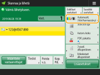 Alkuperäisen ylä- ja alareunan määrittäminenVoit määrittää asiakirjan suunnan ennen skannausta, jotta ylä- ja alareuna ovat oikeissa kohdissa, kun lähetetty tai tallennettu tiedosto näytetään tietokoneessa. Jos asetat A4-alkuperäisen, valitse skannauksen perustoimintonäytössä <Lisäasetukset> <Yläreuna takana> <Alkup. sisällön suunta> <OK>.Jos asetat suuria alkuperäisiä, kuten A3-kokoisia, valitse skannauksen perustoimintonäytössä <Lisäasetukset> <Alkup. sisällön suunta> valitse <Yläreuna takana> tai <Yläreuna sivulla> alkuperäisen suunnan mukaan valitse <OK>.Useiden vastaanottajien määrittäminen, mukaanlukien faksitJos <Salli faksi skannausja lähetystoiminnassa> -asetuksena on <Kyllä>, voit määrittää faksivastaanottajat skannauksen perustoimintonäytössä (<Näytä faksitoiminto>). Tämä asetus on hyödyllinen kun määritetään useita vastaanottajia mukaanlukien fakseja, kuten tallennettaessa kopiota lähetetystä faksista tiedostopalvelimeen. Skannattujen kuvien tarkistaminen ennen lähetystä tai tallennustaVoit tarkistaa skannatut kuvat esikatselunäytössä ennen lähetystä tai tallennusta. Skannattujen alkuperäisten tarkistus ennen lähetystä/tallennusta (Esikatselu) Usein käytettyjen asetusten tallentaminenVoit yhdistää usein käytetyt vastaanottajat ja skannausasetukset laitteen painikkeeseen myöhempää käyttöä varten. Painamalla tallennettua painiketta kun skannaat alkuperäisiä, voit nopeasti koostaa asetuksesi. Usein käytettyjen toimintojen yhdistelmän tallentaminen |