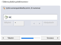 Määritä faksitoiminnon käyttöön tarvittavat asetukset. ![]() Jos faksaukseen tarvittavaa lisävarustetta (Järjestelmän lisävarusteet) ei ole asennettu, jatka vaiheeseen 10. Valitse maa/alue, jos valintaikkuna avautuu, ja valitse sitten <Seuraava>. ![]() ![]() Kirjoita faksinumero ja valitse <Seuraava>. Lisätietoja faksiasetuksista on kohdassa Faksilinjan asetukset. ![]() ![]() Valitse <Aseta>, kirjoita käyttäjänimi ja valitse <Seuraava>. ![]() ![]() Valitse linjatyyppi ja valitse <OK>. | |