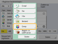 ![]() | Meerdere bestemmingen die zijn opgeslagen in het adresboek (Bestemmingen registreren in het adresboek), kunnen worden gecombineerd tot een groep. U kunt deze functie gebruiken om documenten te verzenden en tegelijkertijd een reservekopie van de gegevens te maken, omdat verschillende typen bestemmingen in dezelfde groep kunnen worden opgeslagen. U kunt bijvoorbeeld e-mailadressen en IP-adressen van de bestandsserver samen in een groep registreren. |
