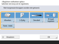 Het aantal instellingen op het scherm met basisfuncties en de plaats waar ze worden weergegeven, kan verschillen afhankelijk van hun functies. Er wordt geen sneltoets weergegeven als <Niet-toegewezen> is ingesteld als een sneltoets. De limiet voor het aantal sneltoetsen voor <Opties> dat u kunt registreren is als volgt. Kopiëren: 5 Fax: 4 Scannen en verzenden: 2 |