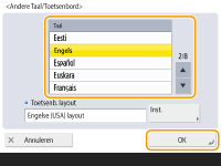 onder aan het aanraakscherm. U kunt de momenteel weergegeven taal naar een andere taal omschakelen door op de <Andere Taal/Toetsenbord>-knop te drukken, selecteer de gewenste taal in de lijst en druk vervolgens op <OK>.