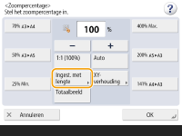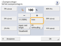 Bij het kopiëren van gelijke zoompercentages op papier met hetzelfde formaat als het origineel, kunnen de randen van het gekopieerde document enigszins wegvallen. Om dit te voorkomen, verkleint u het document door op <Zoom perc.> <Totaalbeeld> te drukken om de ontbrekende randen van het document er wel op te krijgen.Als u <Totaalbeeld> selecteert, wordt <Beeldverschuiving> automatisch op <Midden> ingesteld. U kunt de Auto-instelling op het scherm Zoompercentage niet gebruiken wanneer u zeer doorzichtige originelen, zoals transparanten, wilt scannen. Gebruik in plaats daarvan de vaste schaalinstelling of zoom met percentage-modus. Indien u <Auto> instelt, dient u handmatig een papierformaat te selecteren. Als u geen papierformaat selecteert, dan wordt het zoompercentage automatisch ingesteld op het formaat van het papier dat zich in papierlade 1 bevindt. |