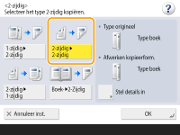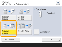 Voor <Boek 2-zijdig> kunt u alleen papier met A4-formaat gebruiken.Plaats uw originelen op de glasplaat wanneer u <Boek 2-zijdig> gebruikt. |