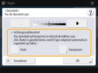 ![]() | U kunt de densiteit van de achtergrond aanpassen. Hiermee kunt u duidelijke kopieën maken van originelen zoals kranten of originelen met gekleurde achtergronden. Aanpassen van de densiteit van de achtergrond van kopieën |
