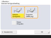 ![]() | Bij het kopiëren van twee kopieën of meer vanuit de aanvoer kunt u sorteren of groeperen selecteren voor de volgorde van de afdrukken. Selecteer "Sorteren" om op volgorde af te drukken. Selecteer "Groeperen" om bundels van elke pagina af te drukken. Dus 10 vellen van de eerste pagina, 10 vellen van de tweede, enzovoorts. |