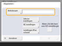 2 | Configureer de noodzakelijke instellingen. ![]() <IKE-mode>Selecteer de bewerkingsmodus voor het protocol voor het uitwisselen van sleutels. Beveiliging wordt verbeterd als u <Hoofd> selecteert, omdat de IKE-sessie zelf is versleuteld, maar de snelheid van de sessie is trager dan met <Agressief>, waarmee niet de hele sessie wordt versleuteld. <Authentificatiemethode>Selecteer een van de onderstaande verificatiemethodes.