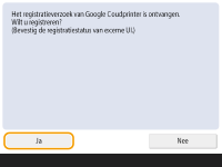 Registreren vanaf een mobiel apparaat of vanuit Google ChromeU kunt de machine registreren vanaf een mobiel apparaat of Google Chrome. Voordat de registratie is voltooid, verschijnt de volgende bevestiging op het scherm van de machine. Druk op <Ja> om de registratie te voltooien. Voor informatie over registratiemethoden raadpleegt u de handleiding van uw apparaat of de startpagina van Google Cloudprinter. |