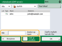 Als u bestemmingen in de LDAP-server zoekt, druk dan op <Zoeken op naam> of op <Zoek op condities>.