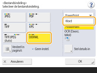 1 | Selecteer <OOXML> en selecteer <Word> uit de vervolgkeuzelijst.![]() ![]() Als u een taal wilt wijzigen voor gebruik voor OCR, drukt u op <Stel details in> <Wijzigen> , selecteert u een taal of talengroep en drukt u op <OK>.Selecteer een taal of een talengroep in overeenstemming met de taal die wordt gebruikt in de gescande documenten. |
