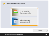 Als <Selecteer optie bij aansluiting van geheugenmedia> is ingesteld op <Aan>, worden snelkoppelingen naar de beschikbare functies weergegeven wanneer u geheugenmedia plaatst. <Selecteer optie bij aansluiting van geheugenmedia> ![]() Omdat de snelkoppelingen mogelijk niet worden weergegeven als het apparaat zich in de slaapstand bevindt, plaatst u het geheugenmedia nadat het apparaat is hersteld van de slaapstand. |