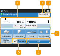Wyświetla status ustawień, takich jak proporcja kopiowania, format papieru i liczba kopii. Upewnij się, że potwierdzono ustawienia, aby rozpocząć prawidłowy proces kopiowania. Aby zmienić ustawienia, należy nacisnąć na przycisk znajdujący się pod wyświetlaną sekcją.